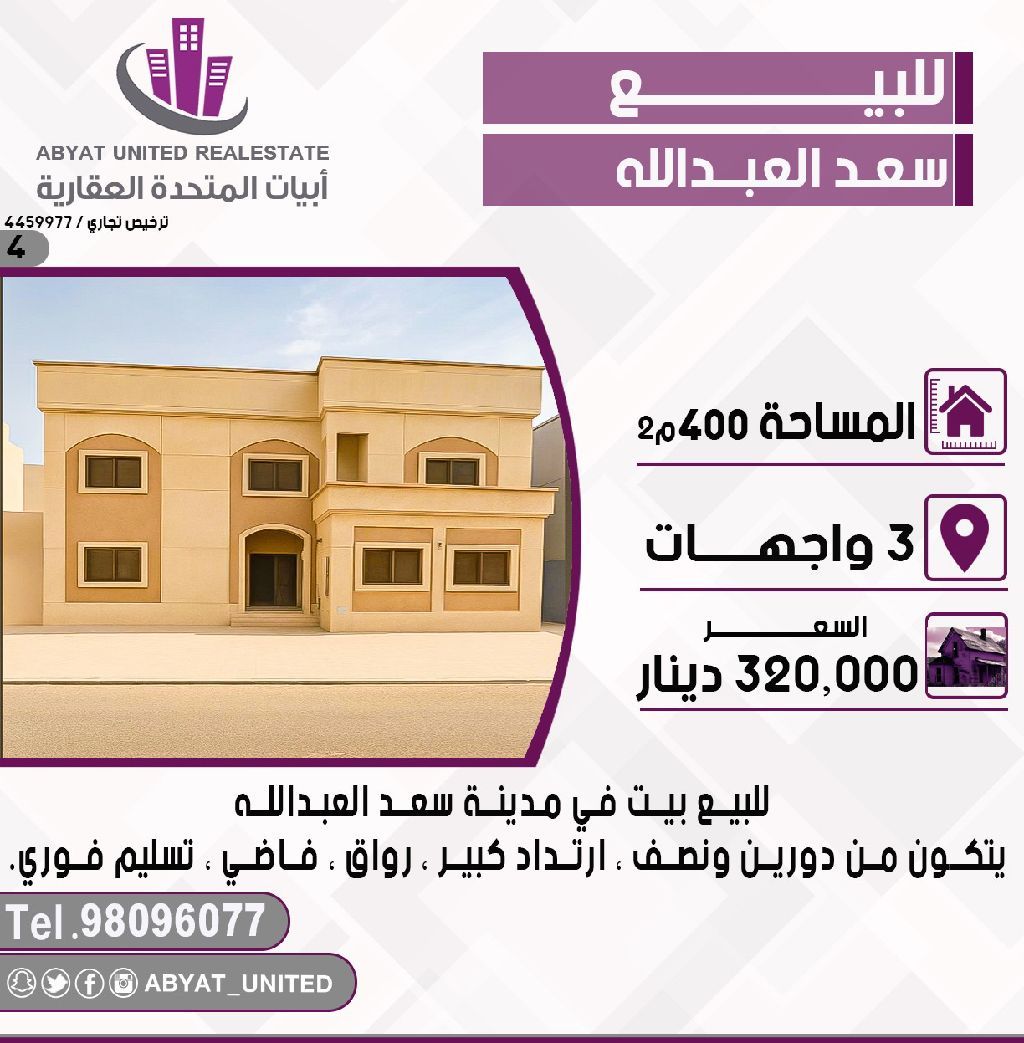 For sale: A house in Saad Al-Abdullah City, Block 3, with three facades. Area: 400 square meters. It consists of two and a half floors, with a large setback, a porch, vacant, and immediate delivery. For inquiries, call Mobile 1. Price: 320,000 dinars. Code: 4.