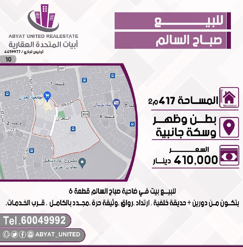 For sale: A house in Sabah Al-Salem suburb, plot 6, with front, back, and side street access. Area: 417 square meters, consisting of two floors, a backyard garden, setback, porch, freehold document, fully renovated, near services. For inquiries, mobile: 1. Price: 410,000 dinars. Code.