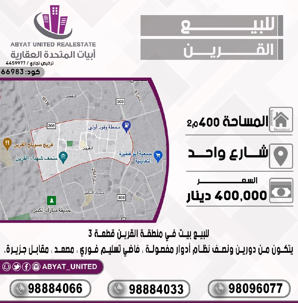 For sale: a house in the Al-Qurain area, Plot 3, located on a one-way street. The area is 400 square meters, consisting of two and a half floors with a separated floor system. It is vacant and ready for immediate delivery, includes an elevator, and is opposite an island. For inquiries, contact Mobile 1, Mobile 2, Mobile 3. Price: 400,000 dinars. Code: 66983.
