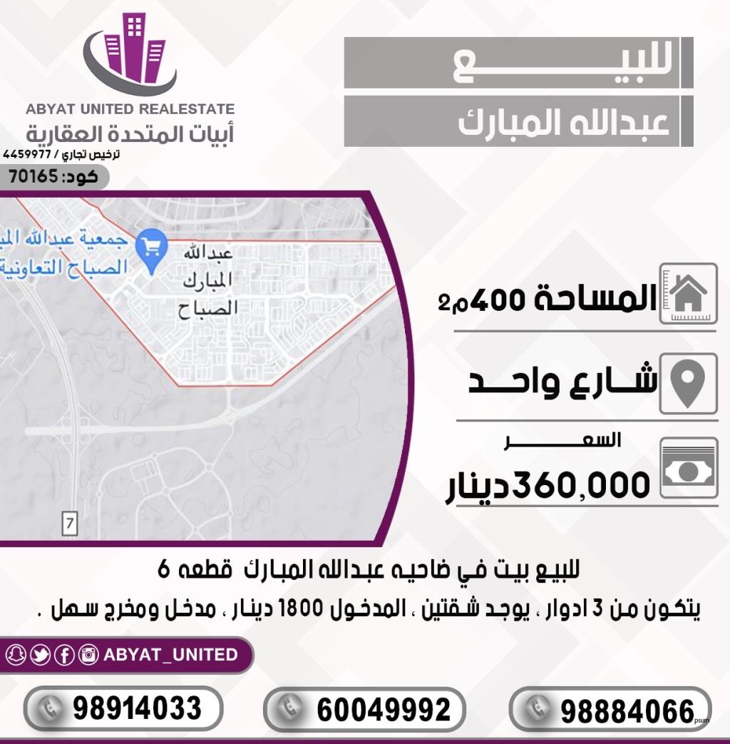 For sale: A house in Abdullah Al-Mubarak Al-Sabah suburb, plot 6, area 400 m², located on a single street, consisting of 3 floors, includes 2 apartments, rental income 1800 dinars, easy access. For inquiries, mobile 1, mobile 2, mobile 3 - Price 360,000 dinars - Code number 70165.
