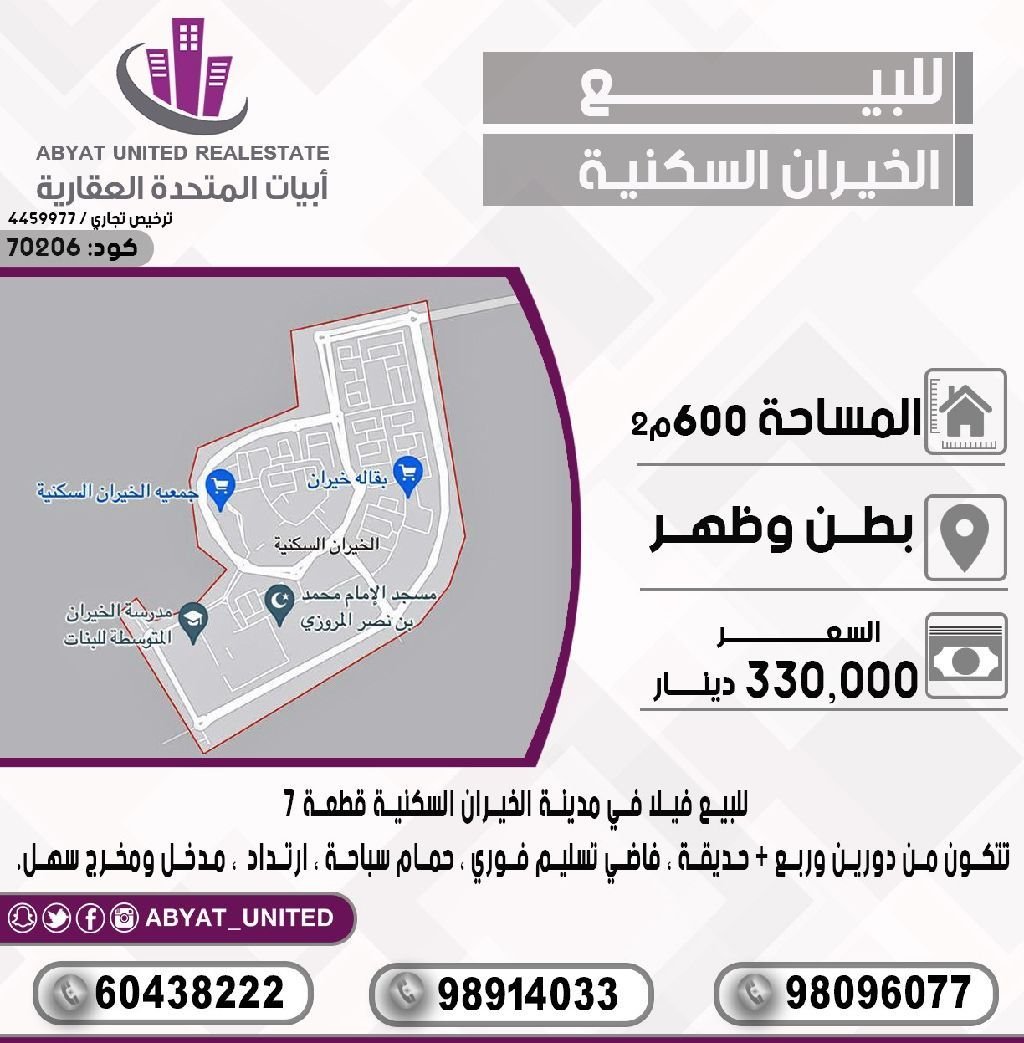 For sale: A villa in Al Khiran Residential City, Plot 7. The location is spacious with front and back access. Area: 600 square meters. It consists of two and a quarter floors, a garden, ready for immediate delivery, a swimming pool, setbacks, and easy entrance and exit. For inquiries: Mobile number 1, Mobile number 2, Mobile number 3. Price: 330,000 dinars. Code: 70206.