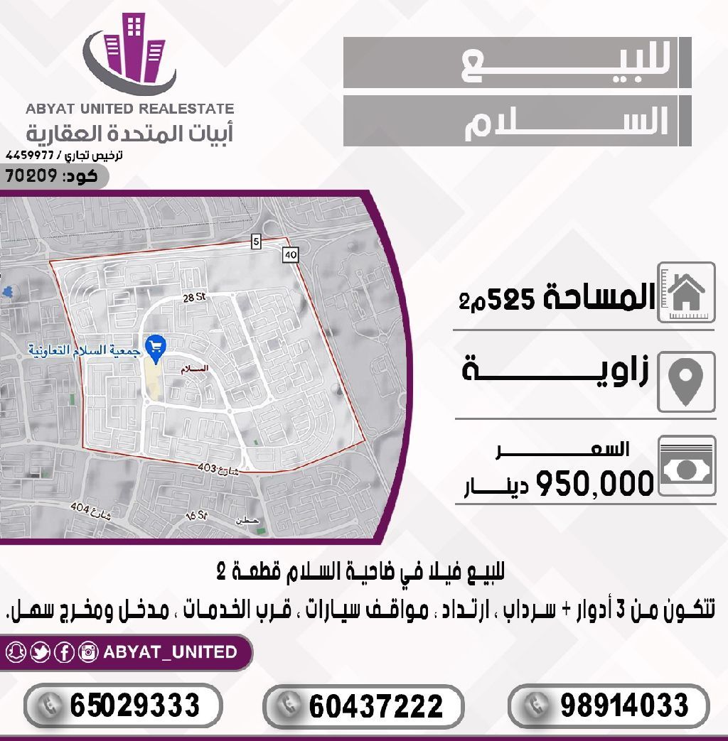 For sale: a villa in Al-Salam suburb, plot 2, corner location. Area: 525 square meters. It consists of 3 floors, a basement, setbacks, car parking, near services, easy access. For inquiries, mobile numbers: 1, 2, 3. Price: 950 thousand dinars. Code: 70209.