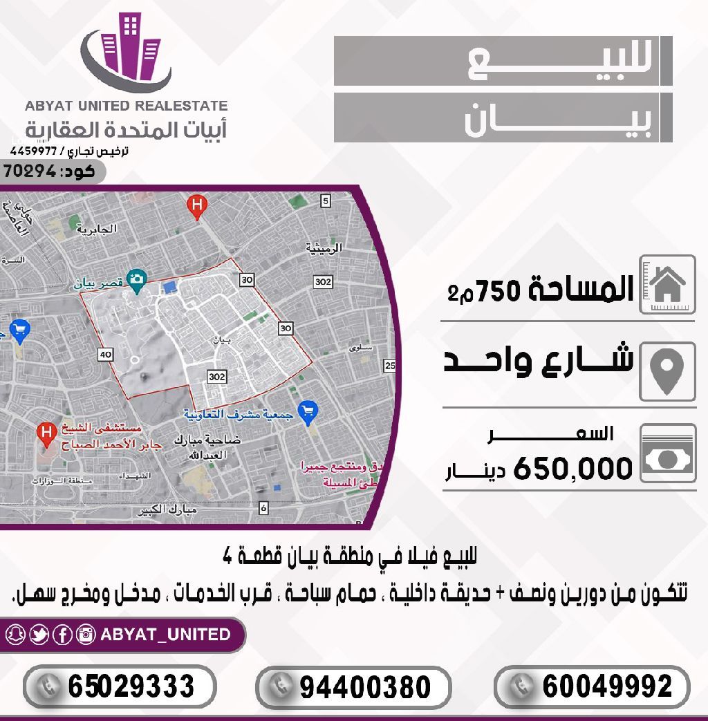 For sale: A villa in Bayan area, Plot 4. Location: One street. Area: 750 square meters. It consists of two and a half floors, an internal garden, a swimming pool, near services, easy entrance and exit. For inquiries: Mobile number 1, Mobile number 2, Mobile number 3. Price: 650 thousand dinars. Code: 70294.