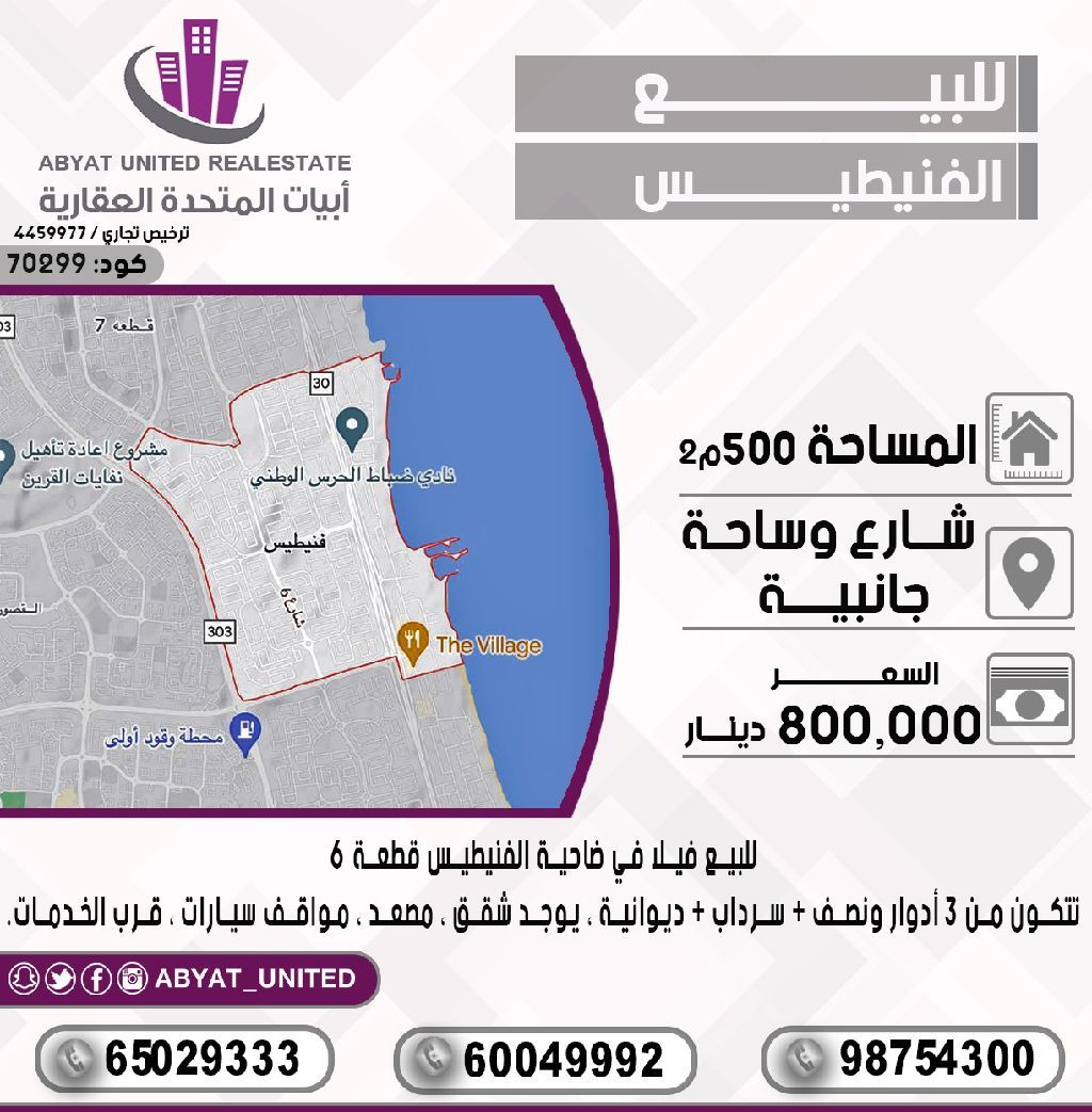 For sale: A villa in Fintas suburb, plot 6. Location: Street with side square. Area: 500 square meters. It consists of 3.5 floors, basement, diwaniya (reception area), includes apartments, elevator, car parking, near services. For inquiries: Mobile number 1, Mobile number 2, Mobile number 3. Price: 800,000 dinars. Code: 70299.