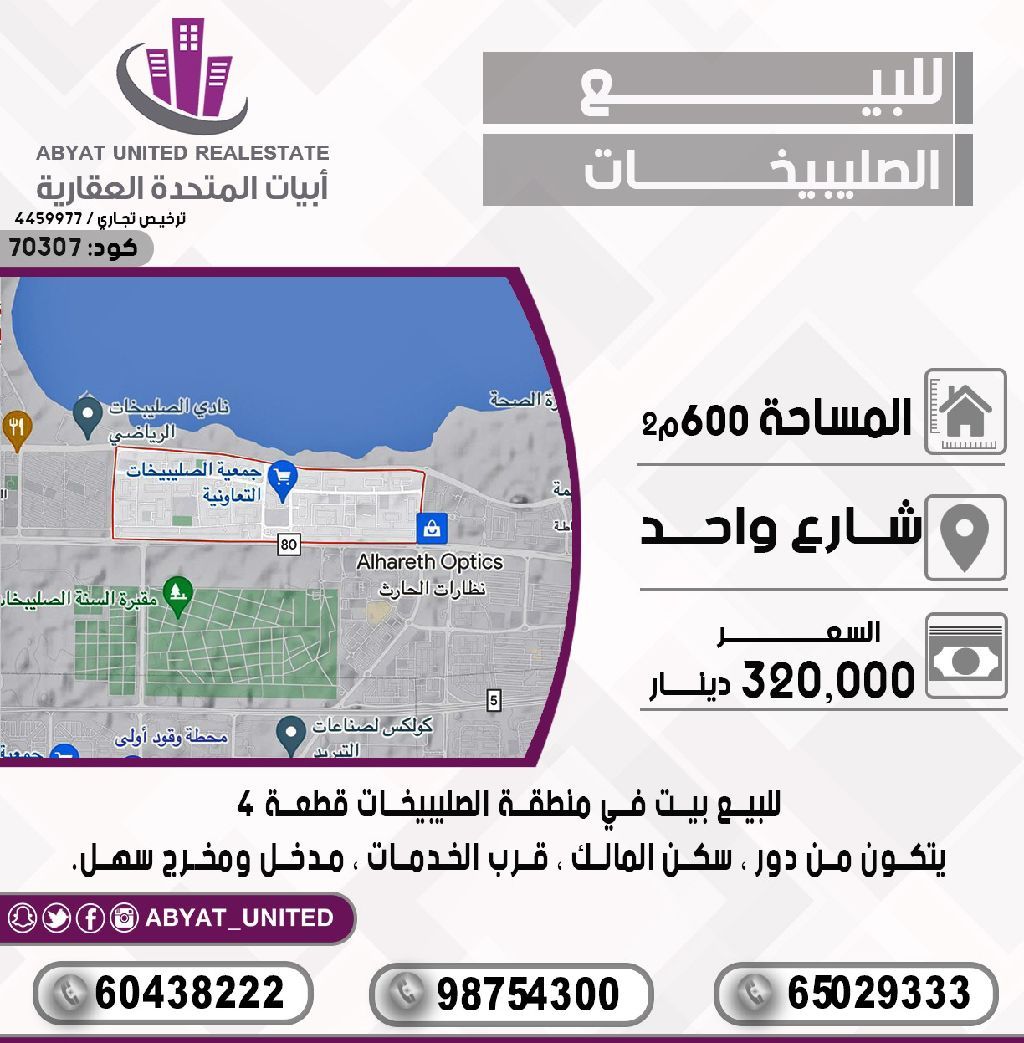 For sale: A house in the Salibiya area, Block 4. Location: Street One. Area: 600 square meters. It consists of one floor, owner-occupied, near services, with easy access and exit. For inquiries, mobile number 1, mobile number 2, mobile number 3. Price: 320,000 dinars. Code: 70307.