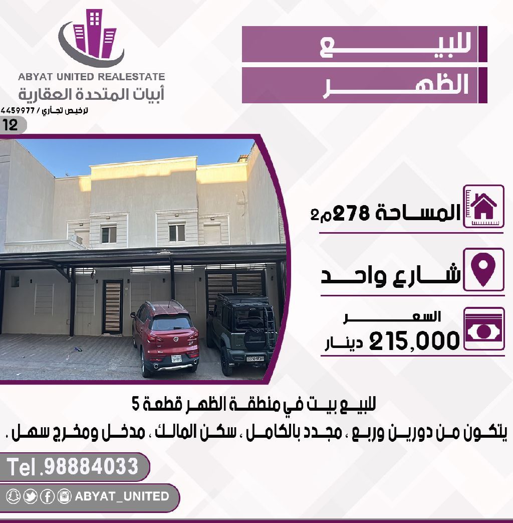 For sale: A house in the Al-Dhahr area, plot number 5, with an area of 278 square meters. The location is on a single street. It consists of two and a quarter floors, fully renovated, owner-occupied, with easy access and exit. Price: 215,000 Kuwaiti dinars. Code: 12.
