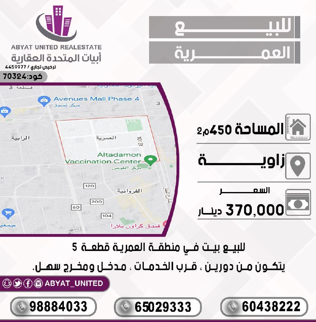 For sale: A house in the Al-Amiriya area, plot 5, corner location. Area: 450 square meters, consisting of two floors, near services, with easy access. For inquiries, mobile numbers: 1, 2, 3. Price: 370,000 dinars. Code: 70324.
