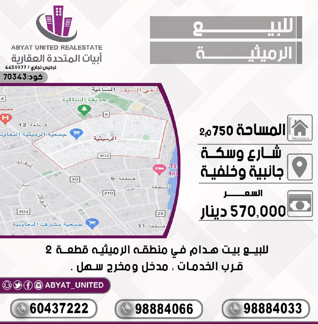 For sale: A house in need of demolition in the Rumaythiya area, plot 2. Location: Street with side and rear access. Area: 750 sqm, near services, easy entrance and exit. For inquiries: Mobile number 1, Mobile number 2, Mobile number 3. Price: 570,000 dinars. Code: 70343.