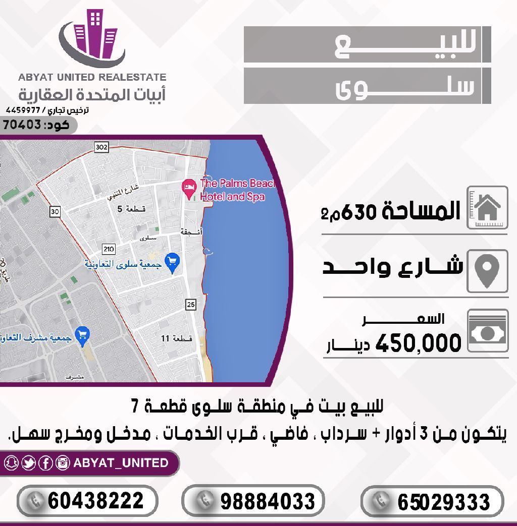 For sale: A house in Salwa area, Block 7. Location: Street One. Area: 630 square meters. It consists of 3 floors, a basement, and is vacant. Close to services, with easy access. For inquiries, contact Mobile Number 1, Mobile Number 2, Mobile Number 3. Price: 450,000 dinars. Code: 70403.