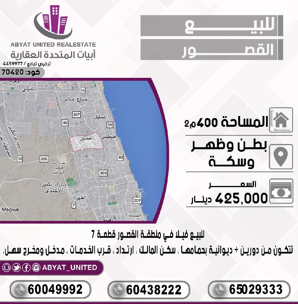 For sale: A villa in the Al-Qusur area, plot 7. The location is central and accessible with a road. The area is 400 square meters, consisting of two floors, a diwaniya with its own bathroom, owner's residence, setback, near services, easy entrance and exit. For inquiries, mobile number 1, mobile number 2, mobile number 3. Price: 425 thousand dinars. Code: 70420.