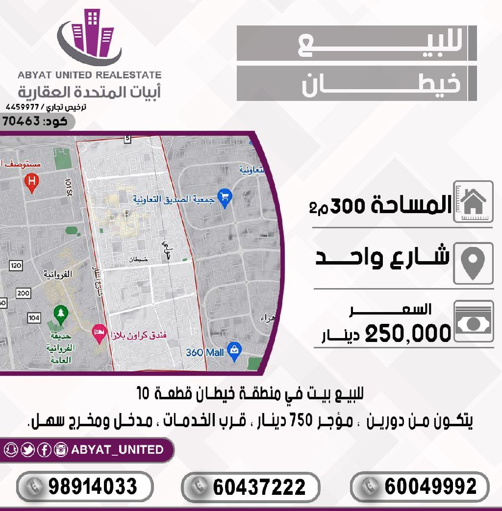 For sale: A house in the Khaitan area, plot 10, located on Street One. The area is 300 square meters, consisting of two floors, currently rented for 750 dinars. It is near services, with easy access and exit. For inquiries, mobile numbers: 1, 2, 3. Price: 250,000 dinars. Code: 70463.