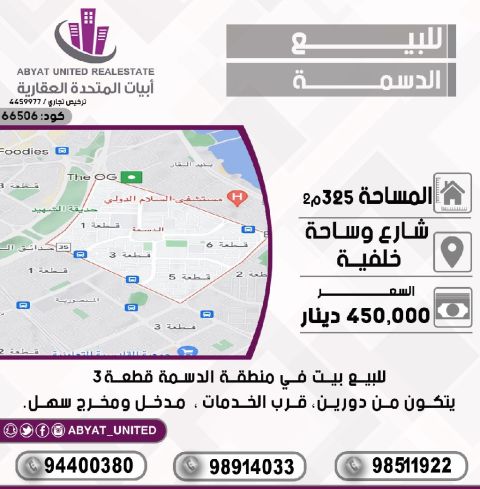 For sale: A house in the Dasma area, Plot 3, corner location. Area: 325 square meters. It consists of two floors, near services, with easy access. For inquiries, call Mobile 1, Mobile 2, Mobile 3. Price: 450,000 dinars. Code: 66506.