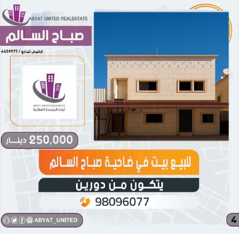For sale: A house in Sabah Al-Salem suburb consisting of two floors. For inquiries, mobile 1. Price: 250,000 dinars. Code: 4.