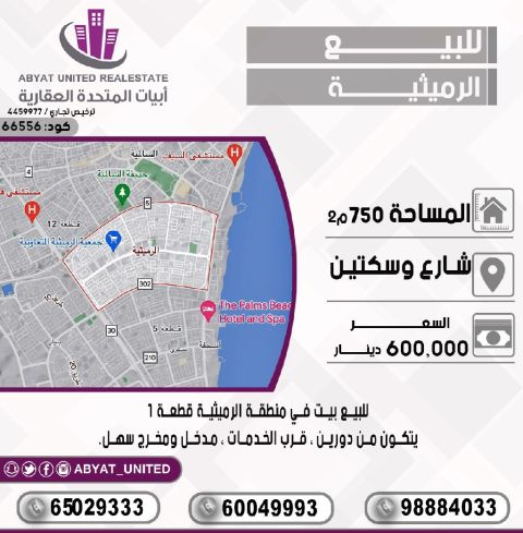 For sale: A house in the Rumaythiya area, Plot 1, located on a street with two lanes. The area is 750 square meters, consisting of two floors, near services, with easy access. For inquiries, call Mobile 1, Mobile 2, or Mobile 3. The price is 600,000 dinars. Code: 66556.
