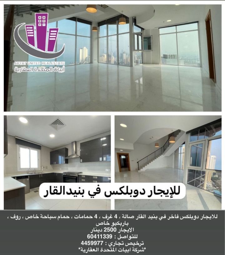 للإيجار: دوبلكس فاخر في بنيد القار، يحتوي على صالة، 4 غرف نوم، 4 حمامات، حمام سباحة خاص، رووف، وباربيكيو خاص. الإيجار: 2500 دينار. للتواصل: ترخيص تجاري 4459977، شركة أبيات المتحدة العقارية.