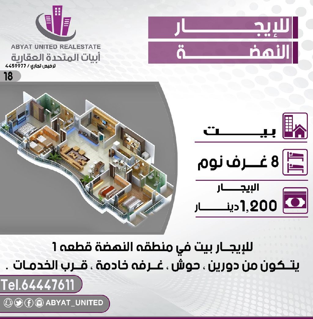 For rent a house in the Al Nahda area, Block 1, consisting of two floors, a courtyard, a maid's room, and close to services. For inquiries, call mobile number 1. rent is 1200 dinars. Code 18