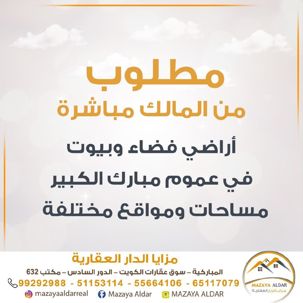 مطلوب من المالمالك مباشرة أراضي فضاء وبيوت في عموم مبارك الكبير، بمساحات ومواقع مختلفة. للاستفسار، الاتصال عبر النقال.