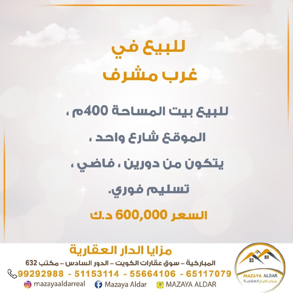 للبيع: بيت في منطقة غرب مشرف، بمساحة 400 متر مربع. الموقع على شارع واحد، يتكون من دورين، فاضي، مع تسليم فوري. للجادين فقط، ويمنع الوسطاء. السعر 600 ألف دينار. للاستفسار، اتصل على الرقم النقال.