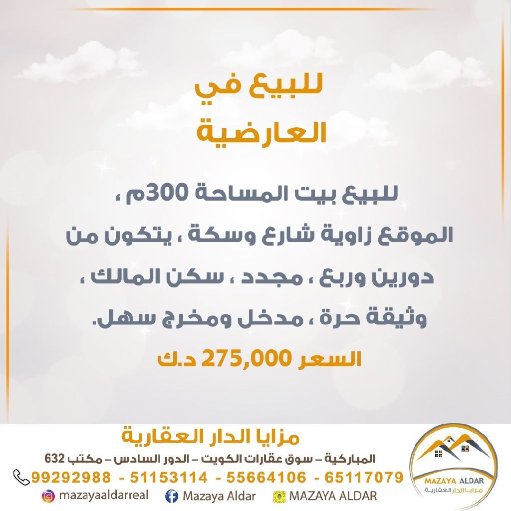 للبيع: بيت في منطقة العارضية بمساحة 300 متر مربع. الموقع في زاوية شارع وسكة. يتكون من دورين وربع، مجدد، سكن المالك، وثيقة حرة، ومدخل ومخرج سهل. للجادين فقط؛ يمنع الوسطاء. السعر: 275,000 دينار كويتي. للاستفسار، اتصل بالرقم النقال.