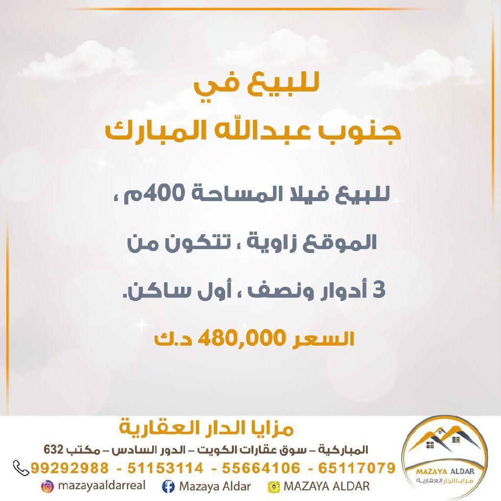 للبيع فيلا في ضاحية جنوب عبدالله المبارك الصباح، المساحة 400 متر مربع، الموقع زاوية، تتكون من 3 أدوار ونصف، أول ساكن. للجادين فقط، ويمنع الوسطاء. السعر 480 ألف دينار كويتي. للاستفسار، الاتصال عبر الهاتف المحمول.