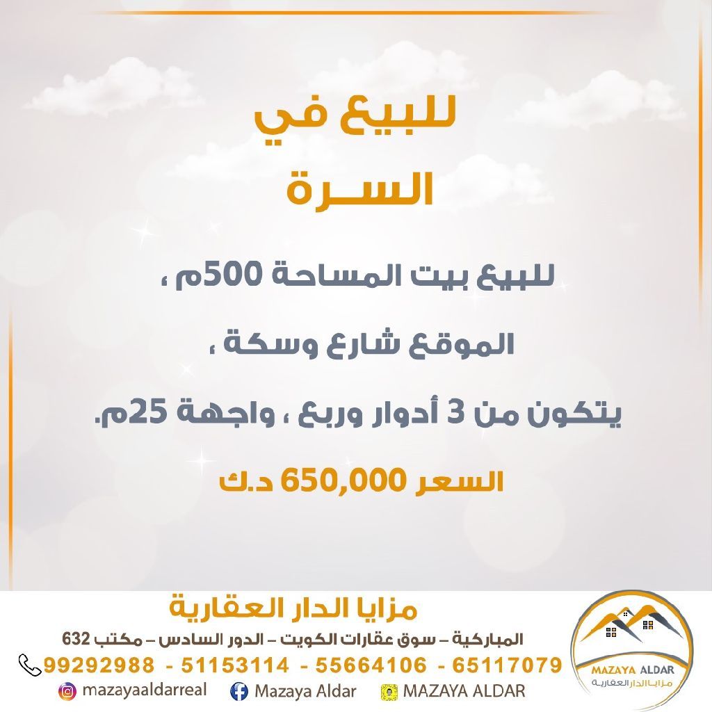 للبيع: بيت في منطقة السرة بمساحة 500 متر مربع. الموقع على شارع وسكة. يتكون من 3 أدوار وربع، بواجهة 25 متر. للجادين فقط؛ يمنع الوسطاء. السعر 650,000 دينار. للاستفسار، الاتصال عبر النقال.
