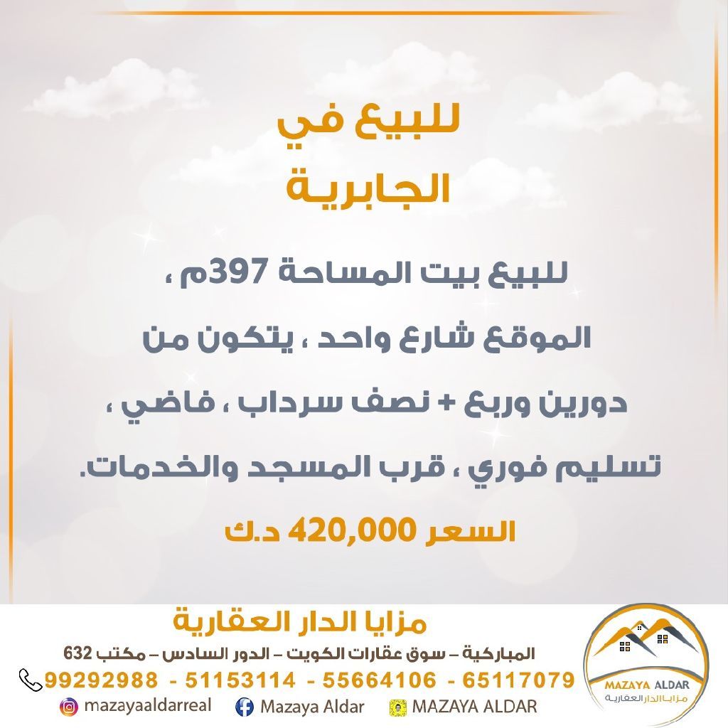 للبيع: بيت في منطقة الجابرية بمساحة 397 متر مربع. يقع على شارع واحد، ويتكون من دورين وربع بالإضافة إلى نصف سرداب، فاضي، تسليم فوري، قرب المسجد والخدمات. للجادين فقط، يمنع الوسطاء. السعر: 420,000 دينار. للاستفسار، اتصل على الرقم النقال.