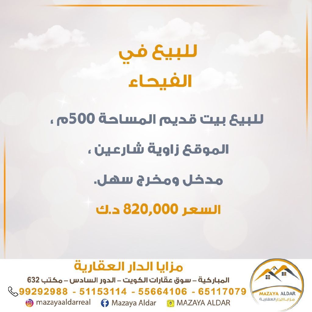 للبيع: بيت قديم في منطقة الفيحاء، بمساحة 500 متر مربع. الموقع في زاوية شارعين، مع مدخل ومخرج سهل. للجادين فقط، وممنوع الوسطاء. السعر 820 ألف دينار. للاستفسار، الاتصال عبر النقال.