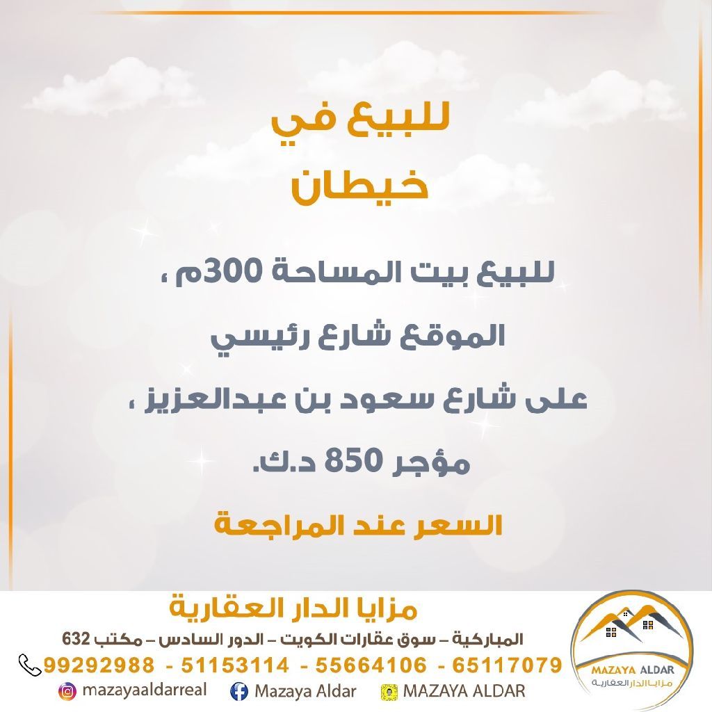 للبيع بيت في منطقة خيطان بمساحة 300 متر مربع. الموقع على شارع رئيسي، تحديداً شارع سعود بن عبدالعزيز. الإيجار 850 دينار كويتي. للجادين فقط، وممنوع الوسطاء. السعر عند المراجعة. للاستفسار، اتصل عبر الهاتف المحمول.