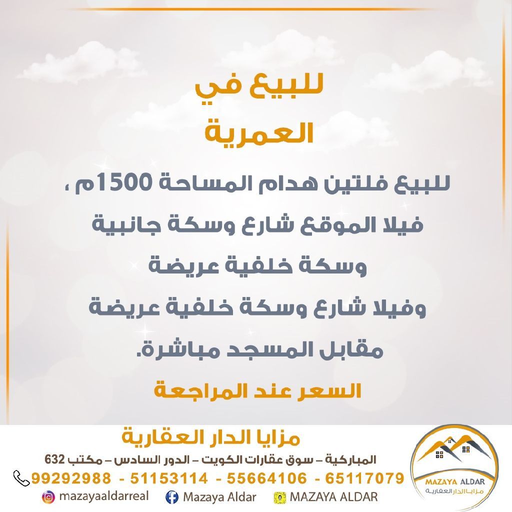 للبيع: فلّتين للهدم في منطقة العمرية. مساحة الأرض 1500 متر مربع. الموقع يضم شارعًا وسكة جانبية وسكة خلفية عريضة. الفيلا تقع على شارع مع سكة خلفية عريضة، مقابل المسجد مباشرة. للجادين فقط، يمنع الوسطاء. السعر عند المراجعة. للاستفسار، اتصل على الرقم النقال.