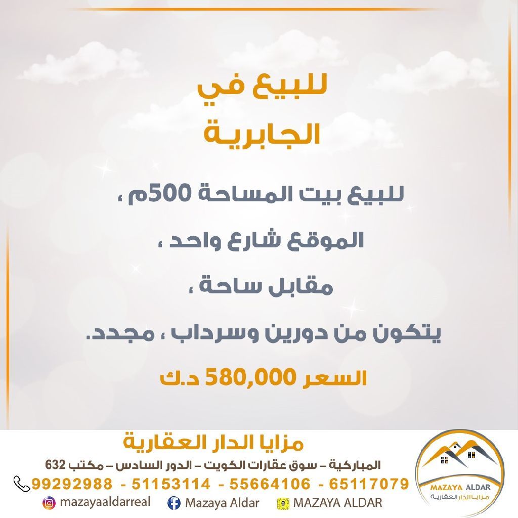 للبيع: بيت في منطقة الجابرية بمساحة 500 متر مربع، يقع على شارع واحد مقابل ساحة. يتكون من دورين وسرداب، وهو مجدد. للجادين فقط، ويمنع الوسطاء. السعر 580,000 دينار كويتي. للاستفسار، اتصل على الرقم النقال.