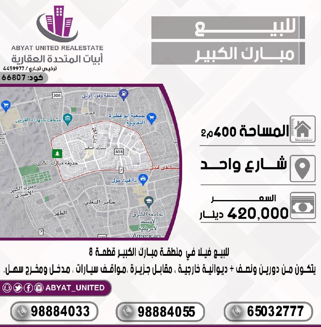 للبيع: فيلا في منطقة مبارك الكبير، قطعة 8، تقع على شارع واحد. المساحة 400 متر مربع، تتكون من دورين ونصف، ديوانية خارجية، مقابل جزيرة، مع مواقف سيارات، ومدخل ومخرج سهل. للاستفسار، اتصل على النقال 1، النقال 2، النقال 3. السعر: 420,000 دينار كويتي. الكود: 66807.