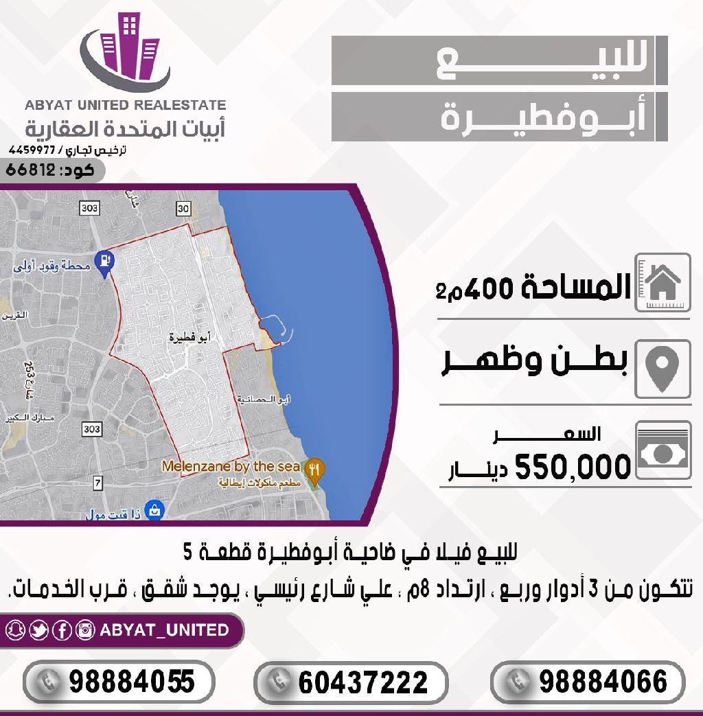 للبيع: فيلا في ضاحية أبو فطيرة، قطعة 5، الموقع: بطن وظهر، المساحة 400 متر مربع، تتكون من 3 أدوار وربع، ارتداد 8 أمتار، على شارع رئيسي، يوجد شقق، قرب الخدمات. للاستفسار، النقال 1، النقال 2، النقال 3. السعر: 550,000 دينار. الكود: 66812.