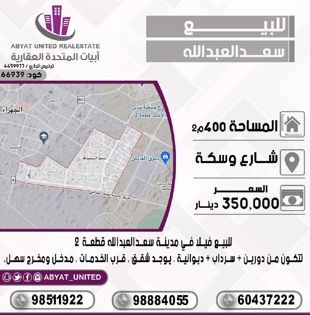 للبيع: فيلا في مدينة سعد العبدالله، قطعة 2، منطقة الموقع، على شارع وسكة. المساحة: 400 متر مربع، تتكون من دورين، سرداب، وديوانية. تحتوي على شقق. قريبة من الخدمات، مع مدخل ومخرج سهل. للاستفسار: النقال 1، النقال 2، النقال 3. السعر: 350,000 دينار كويتي. الكود: 66939.