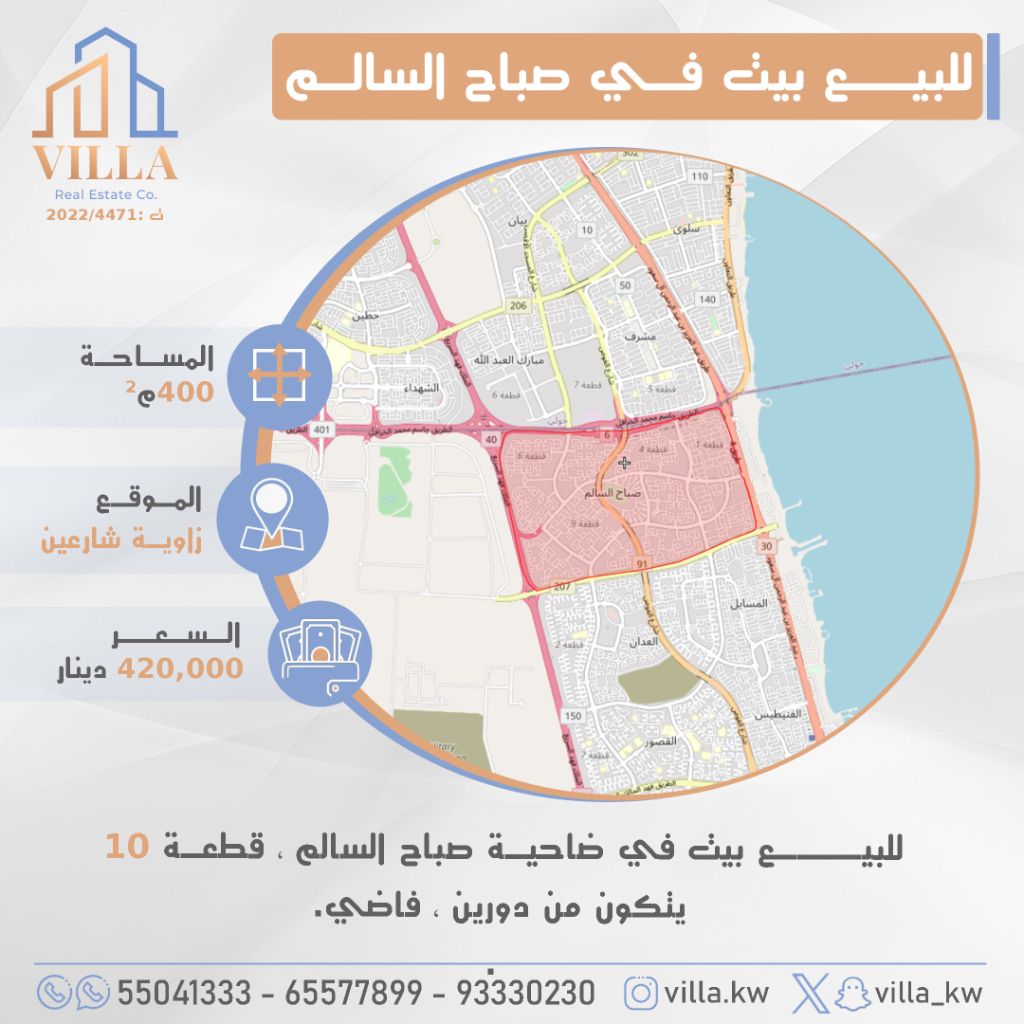 للبيع بيت في ضاحية صباح السالم، قطعة 10، المساحة 400 متر مربع، الموقع زاوية شارعين، يتكون من دورين، فاضي. السعر 420,000 دينار كويتي. للاستفسار، نقال 1، نقال 2، نقال 3.