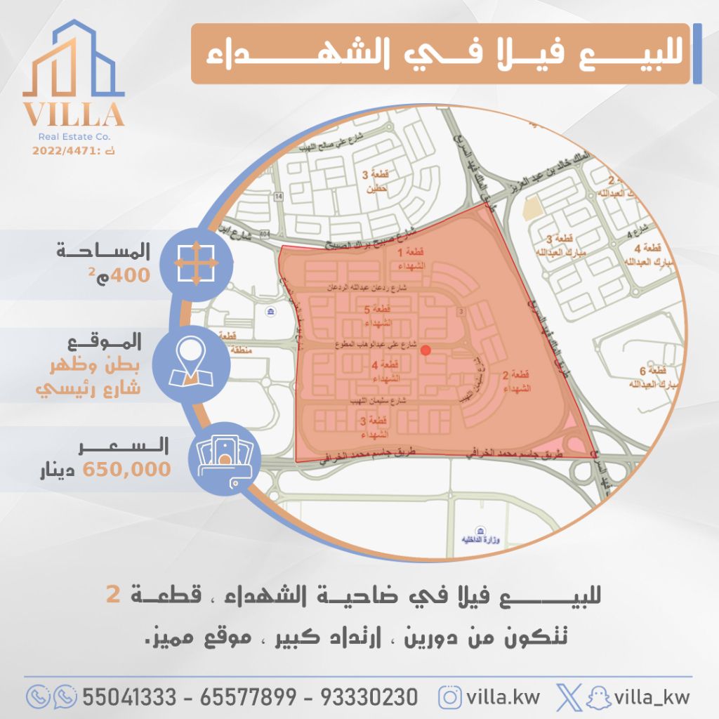 للبيع فيلا في ضاحية الشهداء، قطعة 2، المساحة 400 متر مربع، الموقع بطن وظهر، شارع رئيسي، تتكون من دورين، ارتداد كبير، موقع مميز. السعر 650,000 دينار كويتي. للاستفسار، نقال 1، نقال 2، نقال 3.
