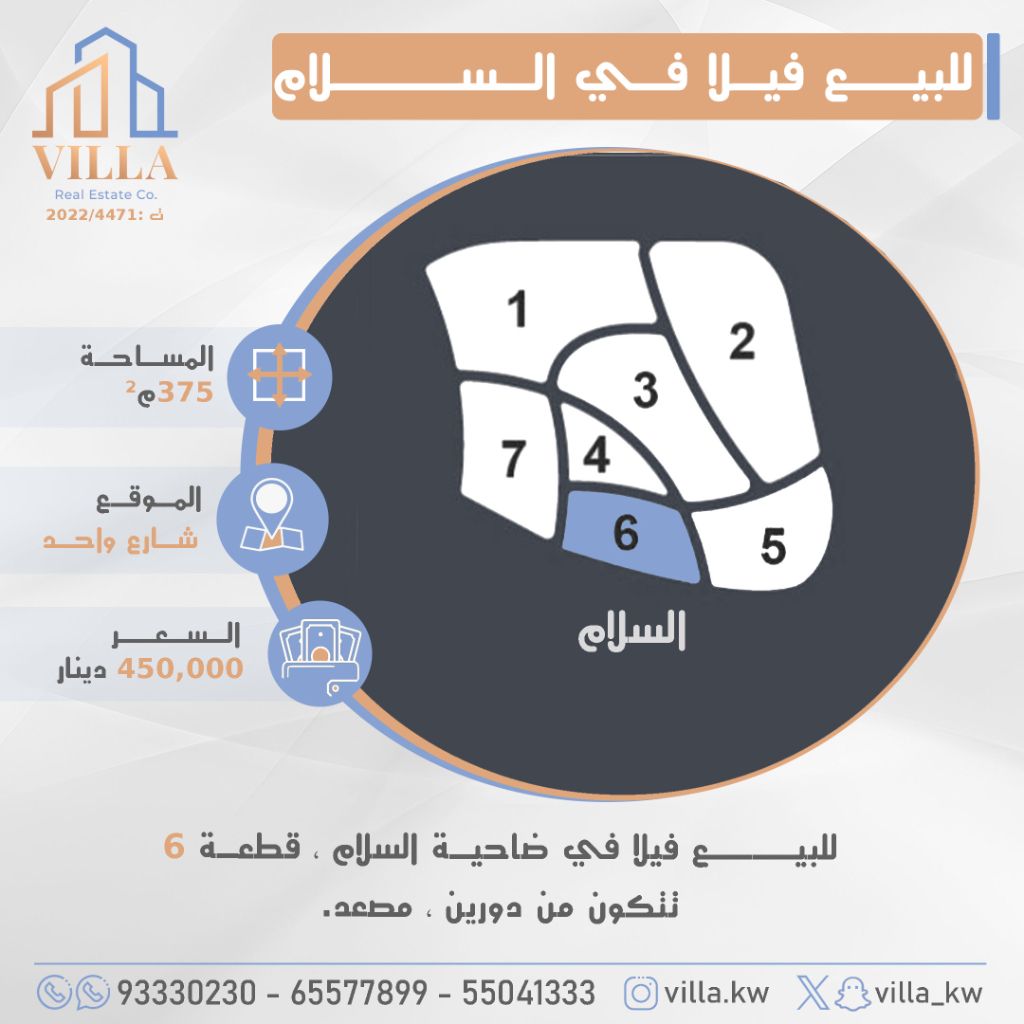 للبيع فيلا في ضاحية السلام، قطعة 6، المساحة 375 متر مربع، الموقع شارع واحد، تتكون من دورين، مصعد. السعر 450,000 دينار كويتي. للاستفسار، نقال 1، نقال 2، نقال 3.