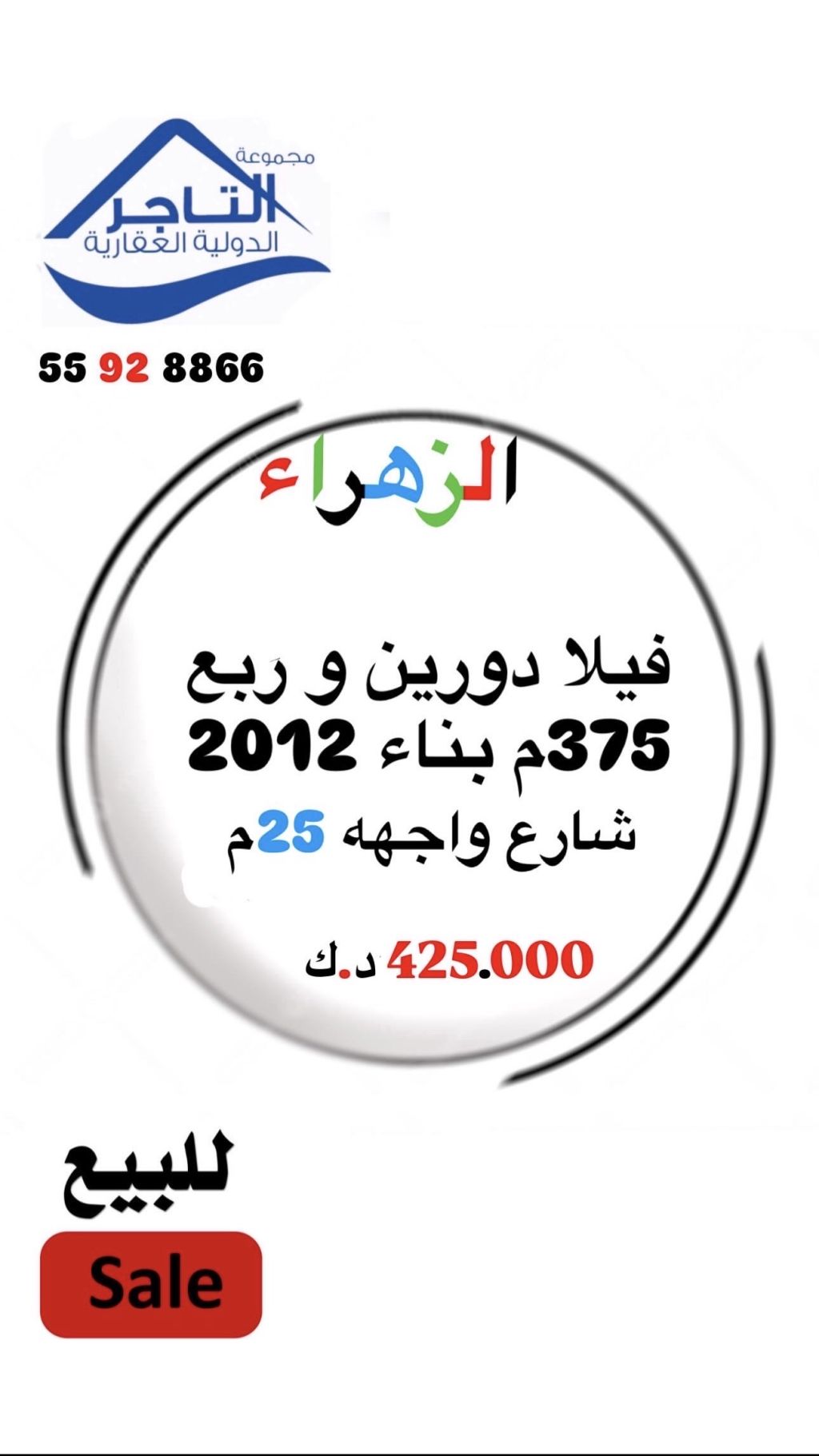 للبيع: بيت في الزهراء، مساحة 375 متر مربع، على شارع واحد واجهة 25 متر. يتكون من دورين: الدور الأول يحتوي على خمس غرف ماستر، مطبخ تحضيري، صالة أرضية، حمام، ديوانية، حمام، غرفة ماستر، غرفة عمالة منزلية، وغرفة سائق. تم البناء في 2012، البيت فاضي. سعر البيع: 425,000.