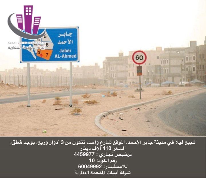 للبيع فيلا في مدينة جابر الأحمد، الموقع شارع واحد، تتكون من 3 أدوار وربع، يوجد شقق، السعر 410 ألف دينار كويتي، ترخيص تجاري رقم 4459977، رقم الكود 10، للاستفسار شركة أبيات المتحدة العقارية.