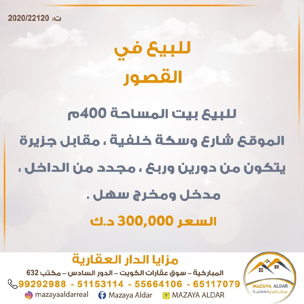 للبيع: بيت في منطقة القصور بمساحة 400 متر مربع. الموقع على شارع وسكة خلفية، مقابل جزيرة. يتكون من دورين وربع، مجدد من الداخل، مع مدخل ومخرج سهل. للجادين فقط، ويمنع الوسطاء. ترخيص تجاري 2020/22120. السعر: 300 ألف دينار. للاستفسار، الاتصال عبر النقال.