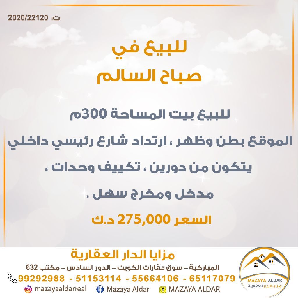 للبيع: بيت في منطقة صباح السالم بمساحة 300 متر مربع. الموقع واسع مع واجهة وخلفية، وارتداد عن شارع رئيسي داخلي. يتكون من دورين، ويحتوي على تكييف وحدات منفصلة، ومدخل ومخرج سهل. للجادين فقط، وممنوع الوسطاء. ترخيص تجاري 2020 / 22120. السعر 275,000 دينار كويتي. للاستفسار، الاتصال عبر الهاتف المحمول.