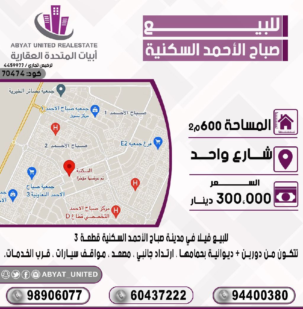 للبيع: فيلا في مدينة صباح الأحمد السكنية، قطعة 3. الموقع: شارع واحد. المساحة: 600 متر مربع. تتكون من دورين، ديوانية بحمامها، ارتداد جانبي، مصعد، مواقف سيارات، وقرب الخدمات. للاستفسار، النقال رقم 1: 989096077، النقال رقم 2، النقال رقم 3. السعر: 300 ألف دينار كويتي. الكود: 70474.