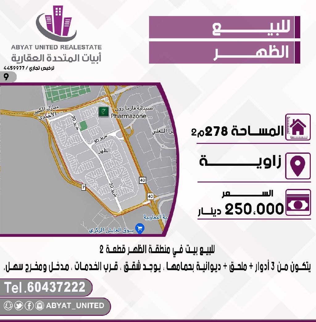 للبيع: بيت في منطقة الظهر، قطعة 2، موقع زاوية. المساحة 278 متر مربع، تتكون من 3 أدوار، ملحق، ديوانية بحمامها، يوجد شقق، قرب الخدمات، مدخل ومخرج سهل. للاستفسار، النقال رقم 1 - السعر 250 ألف دينار - الكود 9.