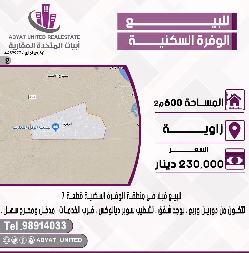 للبيع فيلا في منطقة الوفرة السكنية، قطعة 7، موقع زاوية، المساحة 600 متر مربع، تتكون من دورين وربع، يوجد شقق، تشطيب سوبر ديالوكس، قرب الخدمات، مدخل ومخرج سهل. للاستفسار، النقال رقم 1 - السعر 230 ألف دينار - الكود 2