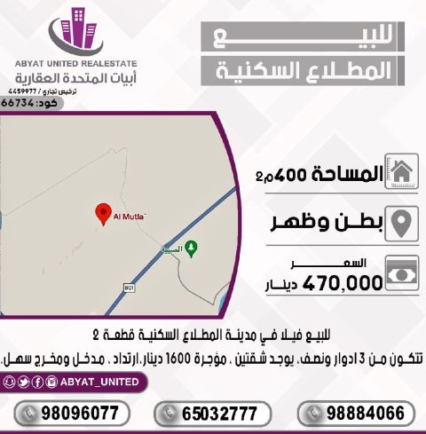 للبيع: فيلا في مدينة المطلاع السكنية، قطعة 2، بموقع أمامي وخلفي. المساحة 400 متر مربع، تتكون من 3.5 أدوار، وتحتوي على شقتين مؤجرتين بمبلغ 1600 دينار. يوجد ارتداد ومدخل ومخرج سهل. للاستفسار، اتصل بالجوال 1، الجوال 2، الجوال 3. السعر: 470,000 دينار. الكود: 66734.