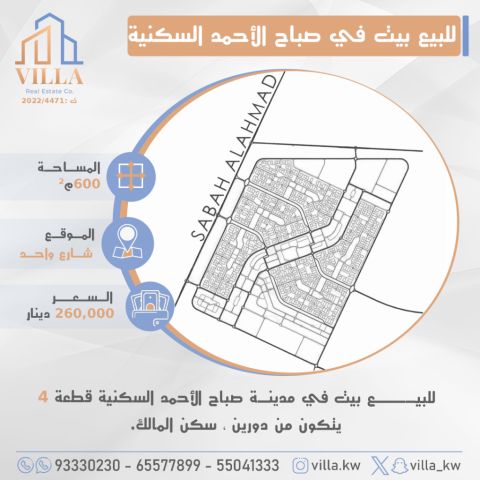 للبيع بيت في مدينة صباح الأحمد - السكنية، قطعة 4، المساحة 600 متر مربع، الموقع: شارع واحد، يتكون من دورين، سكن المالك. السعر: 260,000 دينار كويتي. للاستفسار، نقال 1، نقال 2، نقال 3.
