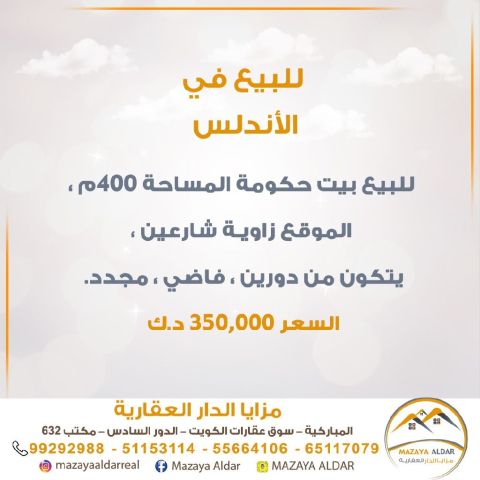 للبيع: بيت حكومة في منطقة الأندلس، بمساحة 400 متر مربع، يقع في زاوية شارعين. يتكون من دورين، وهو فاضي ومجدد. للجادين فقط، ويمنع الوسطاء. السعر 350 ألف دينار. للاستفسار، اتصل عبر النقال.