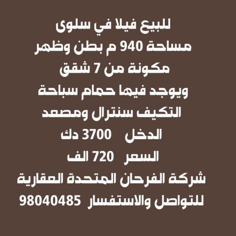 للبيع فيلا في سلوى مساحة 940 متر مربع، مكونة من 7 شقق، وتحتوي على حمام سباحة وتكييف مركزي ومصعد. الدخل الإيجاري 3700 دينار كويتي، والسعر 720000 دينار كويتي. للتواصل والاستفسار، شركة الفرحان المتحدة العقارية