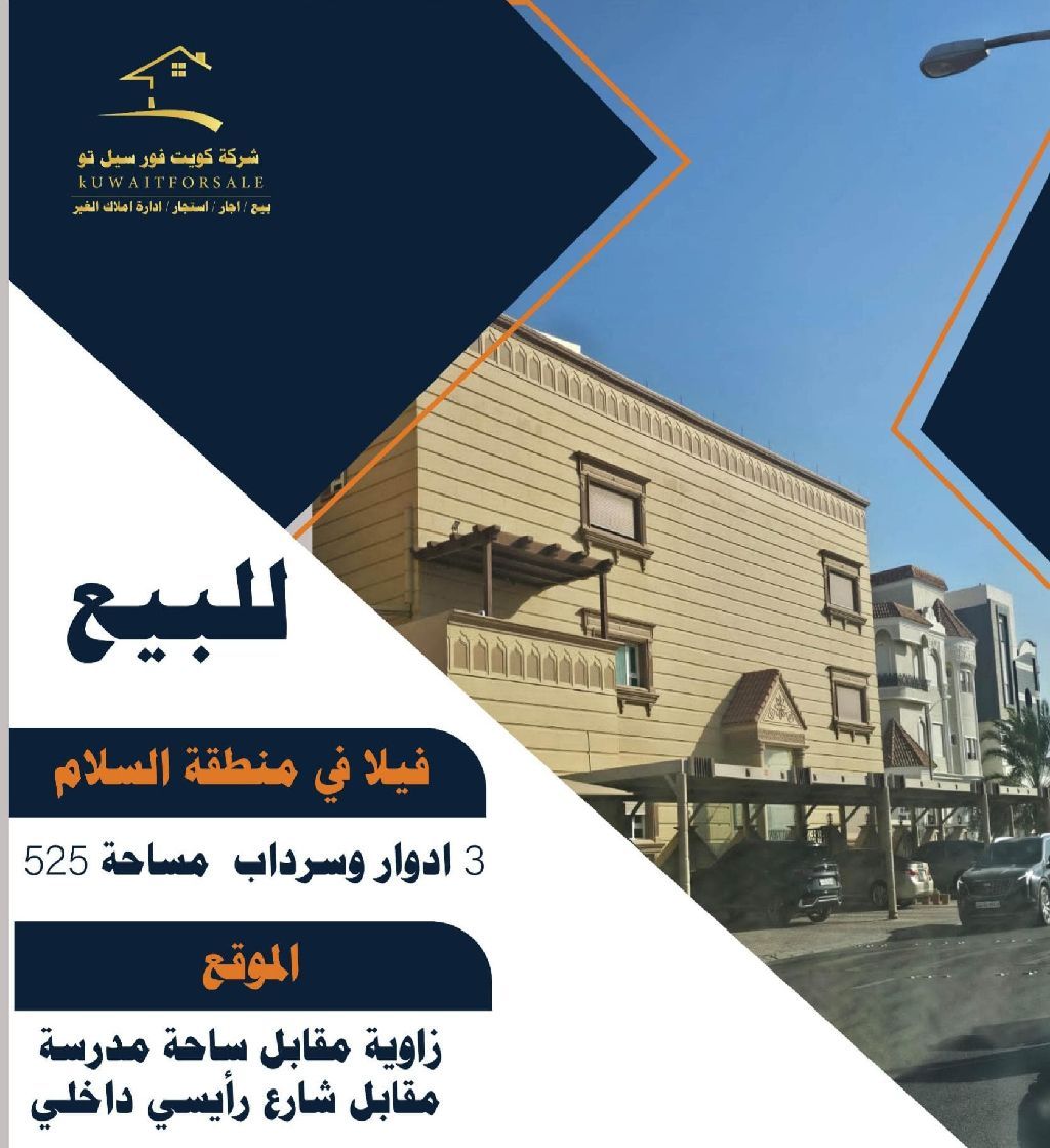 For sale, a villa in Al Salam with a prime corner location opposite a square and main street. It has 3 floors and a basement, with a total area of 525 SQM. The floors are separated, with a 30 - meter front facade and 18 - meter side facade. The basement includes a diwaniya (reception area) with a bathroom and laundry room, two large halls, a guest bathroom, and a fully equipped kitchen. The ground