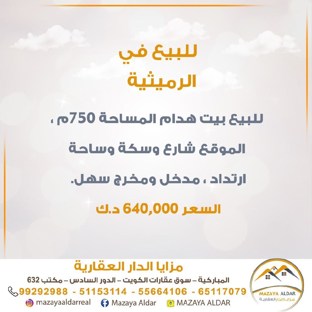 For sale: a demolished house in the Al-Rumaithiya area, with an area of 750 square meters. The location features a street, an alley, and a square, with setbacks, and easy access and exit. For serious buyers only, and brokers are prohibited. The price is 640,000 Kuwaiti dinars. For inquiries, contact via mobile.