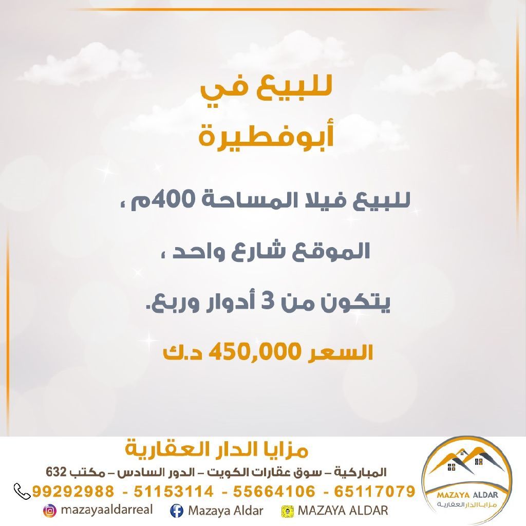 For sale, a villa in the Abu Fatira suburb with an area of 400 square meters, located on a single street. It consists of three floors and a quarter. For serious buyers only, and brokers are prohibited. The price is 450,000 dinars. For inquiries, contact via mobile.